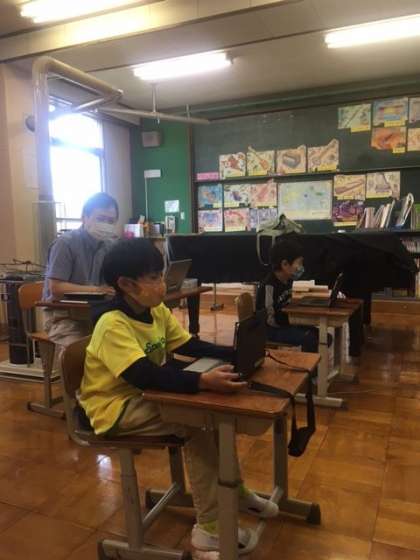 4年生の音楽。モーツァルトのオペラ「魔笛」の中で歌われるパパゲーノとパパゲーナの「パパパの二重唱」が題材です。YouTubeの動画を見ながら二重唱のよさを感じ取るとともに,パパパの音程を聞き取りその高低の変化をからだを使って表現しました。児童はロイロノートの使い方にも慣れてきました。