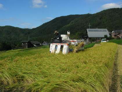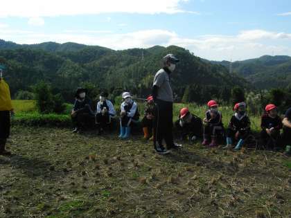 校内での脱穀が終わった後,ご指導いただいている農家の方が機械で脱穀する様子を見学させてもらいました。
