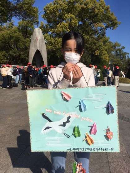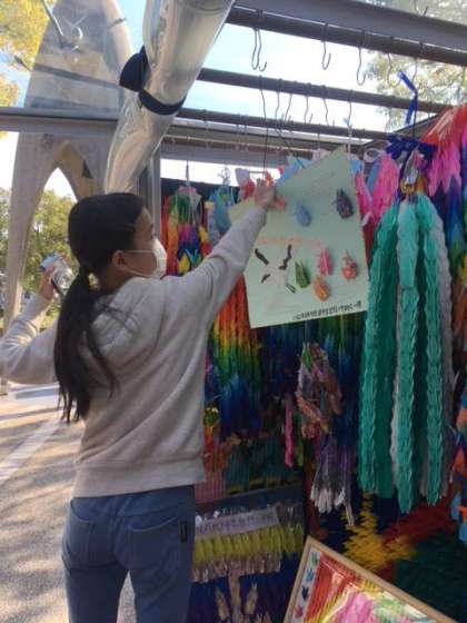 原爆の子の像で祈りの黙祷を行った後、みんなで作った折り鶴を捧げました。