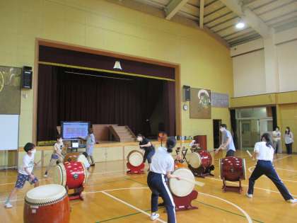上級生は「黒潮」の曲を練習しています。3年生は上級生が太鼓を打つ姿を見たり、画面を見ながらリズムを覚えようとしたりして頑張っています。