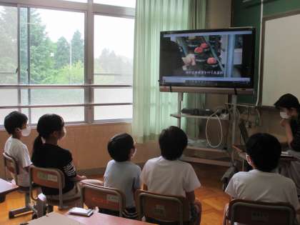 ファーストステージの子どもたちは、山梨の果物モモについてオンライン学習を行いました。