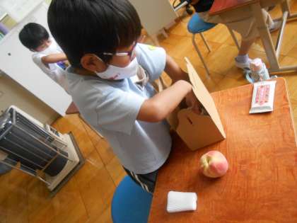 箱作りやモモの箱詰め実習を一人ずつ体験し、試食も行いました。「皮ごと食べたのは初めて!」「とっても甘い」「美味しい」と歓声を上げていました。