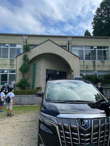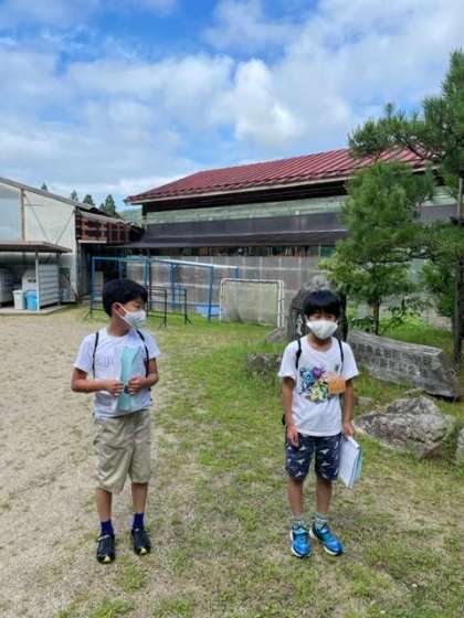 5年生2名、二泊三日の長期宿泊学習です。若狭青少年自然の家に向かいます。出発式を行なってます。