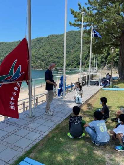 はじまりの集い。風で旗がなびきます。