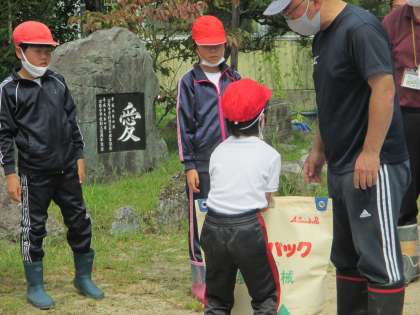 上級生が下級生に手ほどきしたり、上手にアドバイスをしたりしてみんなで協力し合ってできました。そして、脱穀したものがどのくらいの重さになったか1人ずつ手に持って確かめました。ずっしり重たいことを実感していました。