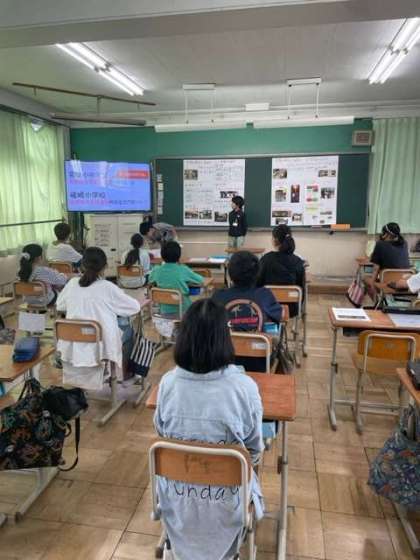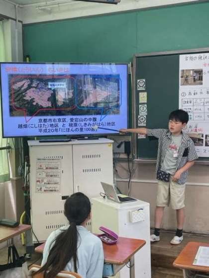 楽しみにしていた嵯峨小学校との交流の日です。写真は嵯峨小学校6年2組の教室です。本校6年児童による学校紹介の様子です。