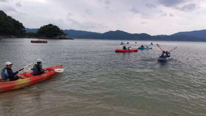 午後の活動の「シーカヤック」です。4人でカヤックを協力して運びました。ペアでこぎだしました。上手に行きたい方向へ漕いでいます。