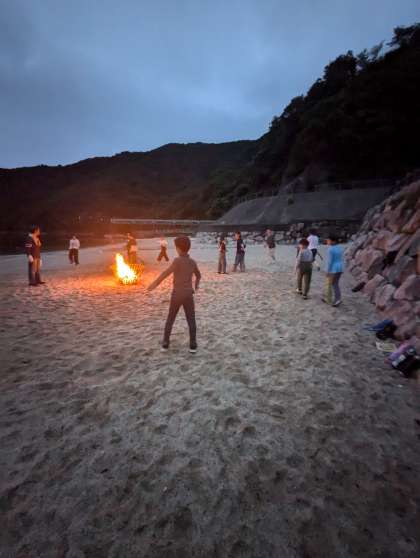 海での活動を終えて、夕食もおいしく、バイキングで2回も取りに行くなど、お腹一杯食べました。キャンプファイヤーでは火の神様に火をつけてもらって、班でレクリエーション係が考えたゲームをみんなで楽しくやっていました。