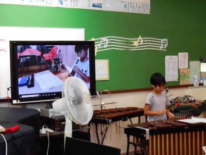 3年生の音楽の授業で合奏をしました。一人学級なのですが、ITCを屈指して3種類の楽器を演奏していました。最後には教職員も加わり、素晴らしい合奏が仕上がりました。