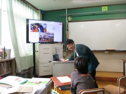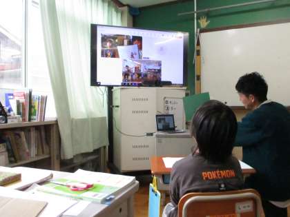 3年生は、花背小中学校の3年生4名とリモートでつないで、国語の授業をしました。クイズを出し合ったり、詩の発表をしたりして、質問や意見の交流をしました。同学年の仲間と画面越しに交流ができて、緊張もしていましたが、楽しく授業に取組めました。