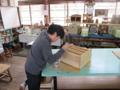 7年生の技術の時間は木材を使って整理棚を制作しています。中に入れるものを想像して、ちょうどいい高さ、幅で木材を切ったり、釘で固定したりして作品を制作しています。今日は仕上げのニス塗をしました。