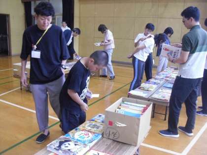3時間目は選書会がありました。本屋さんに持ってきていただいた300冊くらいの本を体育館に並べて、1人5冊ずつ好きな本、読みたい本を選びました。