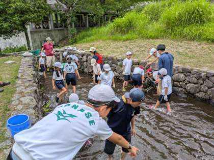 動きが素早いイワナです。端に追いやると捕まえやすいと気づきがありました。初めは怖がっていた子どもも必死に捕まえて、捕ったどーと嬉しそうです。