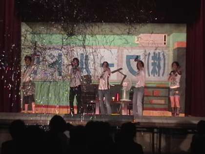 写真は,上から小学校の劇,中学校の劇と小中合同の合奏です。
