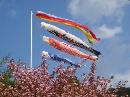 4月28日(火) 地域の方のご好意で貸して頂いた鯉のぼりです。遅咲きのぼたん桜が満開の校庭の空で元気に泳いでいますよ。