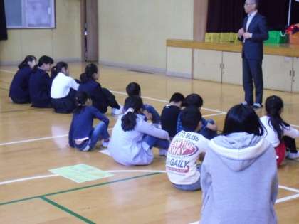 本校は,児童と生徒の全員で朝会を行っています。今月は,憲法や学校のきまりの大切さについて,校長先生からお話を聴きました。そのお話をもとに,誰もが気持ちよく過ごすための言葉の力について考えました。そのあと,生徒会役員の認証式を行いました。