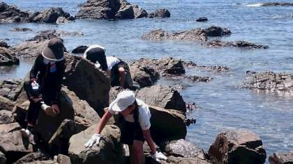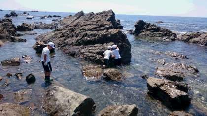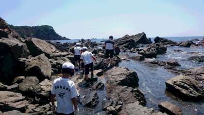水に太陽の光が反射し水がきらきらひかる中,子どもたちは磯観察に夢中です。いろいろな生きものが見つかるたび,友だちを呼ぶ子どもたちの楽しそうな声が聞こえてきます。