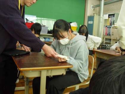 京都扇子団扇商工協同組合から来ていただいて、京の匠 伝統工芸(扇子)を体験しました。初めに扇の歴史や種類について講義をしていただきました。そして、児童生徒たちは事前に絵付けをしていた折地に扇の骨となる扇骨を通して自分のオリジナルの扇を作りました。最後に、扇を使った伝統的な遊び「投扇興」をしました。「投扇興」は見た目よりも難しかったのですが、みんなで楽しく活動することができました。