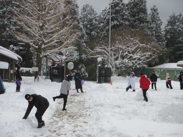 昼休みの「わくわくタイム」で児童生徒と教職員で雪合戦をしました。2チームに分かれて、相手の陣地にあるボールを先に取った方が得点を獲得します。2点先取で勝利という方式でゲームを行いました。両チームとも作戦を考えて、お互い全力でプレーしました。