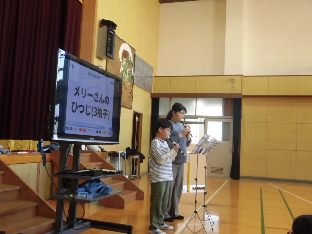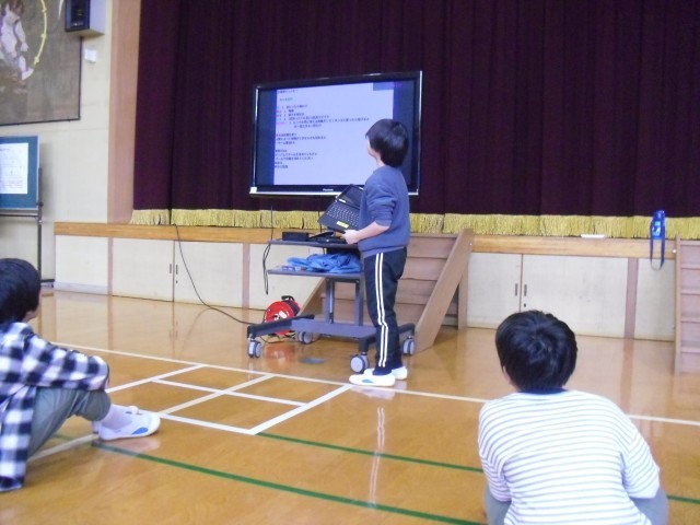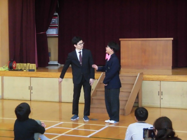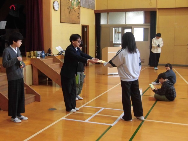 3時間目と4時間目に、児童生徒と教職員で「お楽しみ会」を行いました。それぞれの学年が工夫した出し物を準備し、体育館いっぱいに笑顔が広がる、あっという間の2時間となりました。まず、4年生が考えたゲーム「ドッヂビー」。特別な能力を持つ姫や勇者、魔法使いなどのキャラクターを決めて、能力を生かしつつ、相手チームの“姫”に当てれば勝ちというルールで、白熱した戦いが繰り広げられました。8年生の出し物「背中を見られたらダメ」では、背中に付けた数字を相手に見られないよう注意しながら、さまざまなミッションに挑戦するというスリル満点のゲームでした。みんな身をかがめたり走ったりしながら、盛り上がりを見せました。6年生の「ケイドロ」では、子どもも大人も本気モード。体育館中を全力で走り回り、息を切らせながら楽しみました。3年生は、国語の教材「ありの行列」からクイズを出題。どれも一度は学習した内容ですが、思い出しながら考えるのは案外難しく、懐かしい気持ちになりながら参加する姿が見られました。また、リコーダーの発表もあり、美しい音色が体育館に響きました。7年生は担任の先生とのコンビで「漫才」を披露。M-1戦士にも負けないほどのおもしろいネタで、体育館中が笑いに包まれました。教職員の出し物は「ペットボトルフリップ」。みんなで挑戦した難しい技でしたが、なんと成功したのは澤井先生ただ一人!大きな歓声が上がりました。どの出し物も工夫が凝らされていて、児童生徒も教職員も一緒になって楽しむ、思い出に残る特別な2時間となりました。