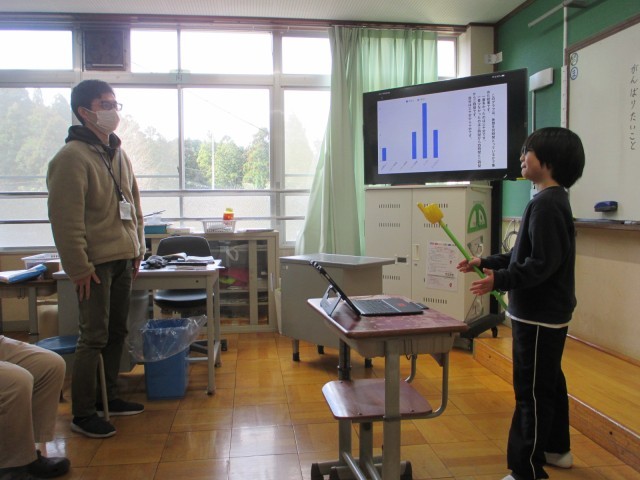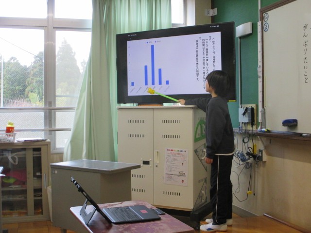 1時間目に、4年生が国語科「調べて話そう 生活調査隊」の学習で発表を行いました。自分が疑問に思ったことについて、他の4年生がどのように考えているのかを調べるため、交流のある嵯峨小学校の4年生にアンケートを実施しました。その結果を分析し、自分の考えとともに分かりやすく発表することができました。総合的な学習の時間で取り組んでいる「疑問をもって探究する学び」が、教科の学習にも生かされている様子が見られました。
