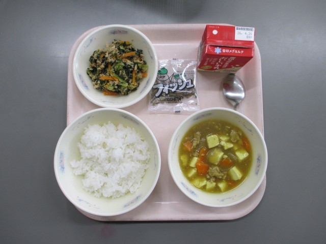 児童生徒のみんなが待ちに待った給食が、今日から始まりました。今日の献立は、**「ごはん・牛乳・和風カレーどうふ・ツナと小松菜のごま炒め」**でした。