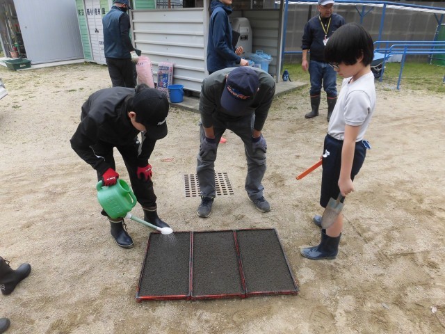 種もみの重さを量ったり、土や種もみを箱の中で均一にならしたり、じょうろでまんべんなく水をかけたりと、一つ一つの作業を丁寧に進めました。何度も経験のある上級生が、経験の少ない下級生にやさしく声をかけながら教える姿も見られ、子どもたちは「苗になるのが楽しみ」と話し、意欲的に取り組んでいました。