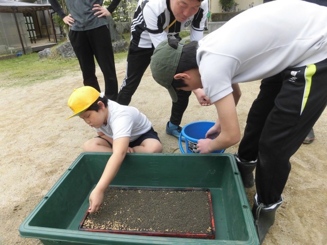 6時間目に、全校児童生徒と教職員で、1年間お世話になる地域の小野様のご指導のもと、米作りの最初の工程である「播種」を行いました。