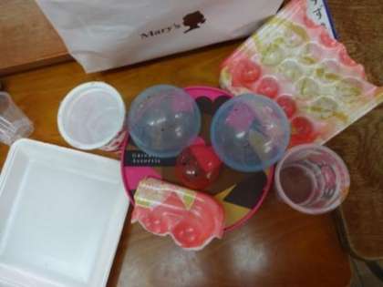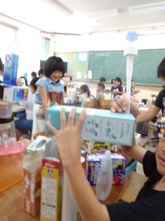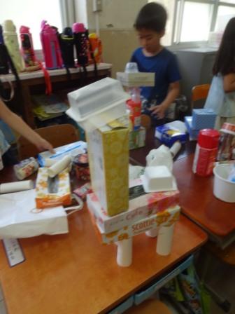 いろいろな形の箱や缶などを使って,動物や乗り物などを作りました。キリンを作るために,細長いものを積み上げたり,トラックのタイヤにするために円柱形のものを探したり,楽しみながら「形」に関して認識を深めることができました。