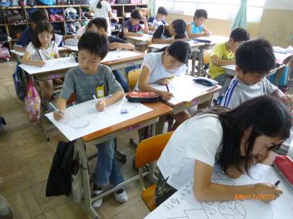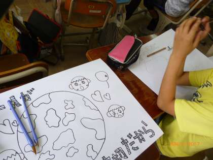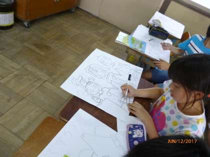 だんだんと下絵ができあがってきました。今日は、もう彩色に入った子もいます。きれいに色塗りがんばっていきましょう。