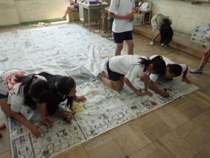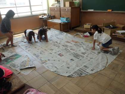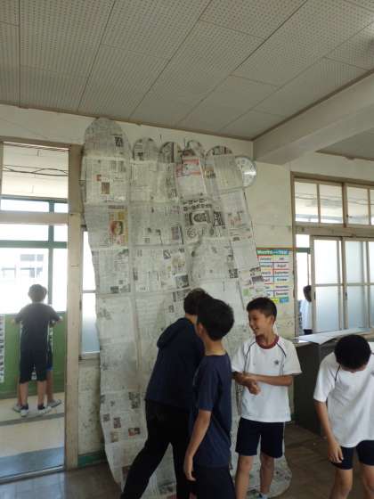 社会科で学習した奈良の大仏を新聞紙で作りました。手や足や頭,そして座高の長さを作りました。どれも大きくて子どもたちは,びっくりしていました。