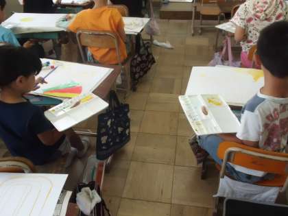 この日はコンテで描いた下絵に絵の具で色をつけていきました。下絵の線をはみ出さないようにていねいに。そして絵の具の色をそのまま使うのではなく,まぜてオリジナルの色を作ってぬっていこうとがんばりました。