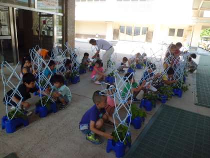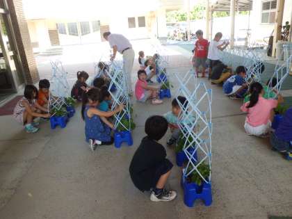 「踏んでしまいそう」「友だちのつるとからまってしまう」ということで,支柱を立てました。