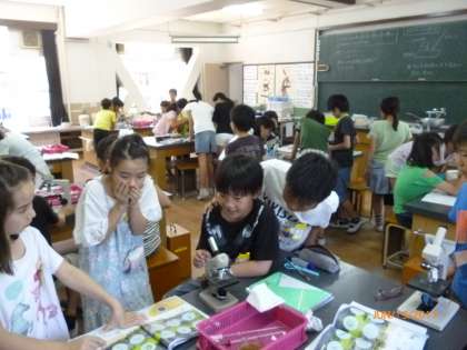 今日は、池の水の中から、小さな生き物をさがして、顕微鏡で見てみました。初めて見た微生物(プランクトン)に、みんなびっくりです。