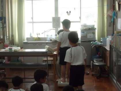 今日は体重測定と歯についてのお話がありました。生えかわりの時期のみんなの歯はでこぼこしていてみがきにくいですね。今日,教えてもらったように歯ブラシの使い方を工夫して,しっかりとみがけるようにしましょう。来週には歯みがき指導もあります。正しいみがき方で虫歯を防ぎましょう。