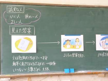 今日の道徳は「誠実」について考えました。お話の主人公の行動を通して、誠実とは何か、どういう人のことかなど、みんなで話し合いました。