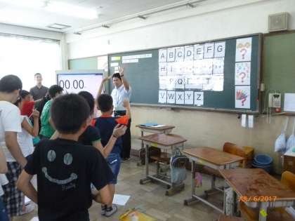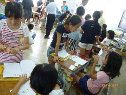 身近な場所で見つけた単語をカードに書いて、既習英語で友だちと交流する授業をしました。「これはなあに?」「何色ありますか?」「いくつの〜がありますか?」「〜は好きですか?」などなど、みんな一生懸命聞いたり答えたりしていましたね。