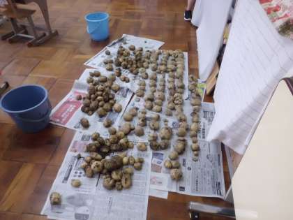 4月から育ててきたじゃがいもを遂に収穫しました。じゃがいもの数は,なんと大小合わせて300個以上でした。うね作り・種イモ植えから収穫まで,いろいろなことがありましたが無事収穫できて本当によかったです。