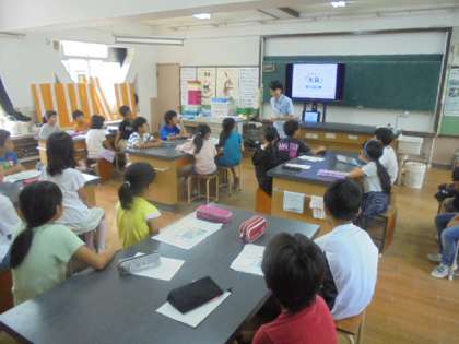 今日は、サントリーから講師の方が来られ、水育の授業をしていただきました。水の大切さや水をずっと使っていくために私たちにできることを考えました。スライドや映像を使いわかりやすく楽しい授業でした。