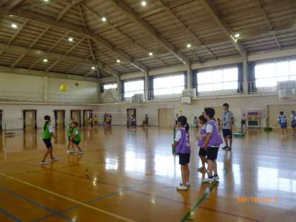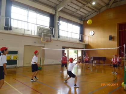 体育は体育館でソフトバレーボールをしました。なかなかラリーが続かなくて難しいです。でも、楽しく活動できました。