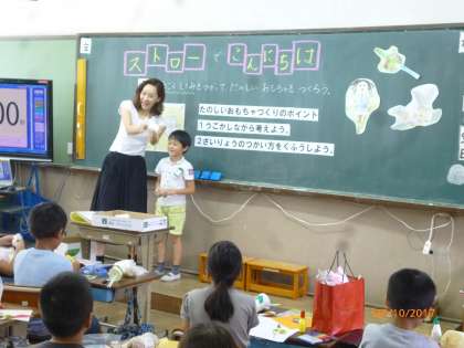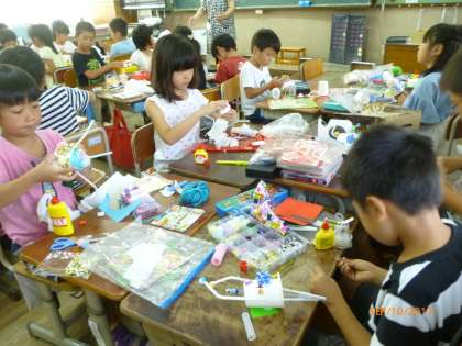 図工では,「ストローでこんにちは」という学習をしました。前回の授業では,紙コップとストローを使って,動く仕組みを作りました。今日は,その仕組みを動かしながら,飾り付けをし,絵を描いていきました。ビーズやモールなどの材料も工夫して,つけていました。一人一人集中して,楽しく作っていました。片付けなども素早く行うことができ,すばらしかったです。