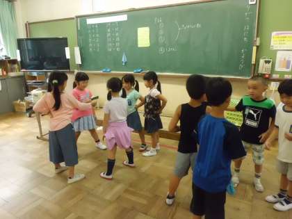 雨の日の休み時間の様子です。輪になってじゃんけんをして,負けたら足を開いていく遊びですね。教室で上手に遊んでいました。