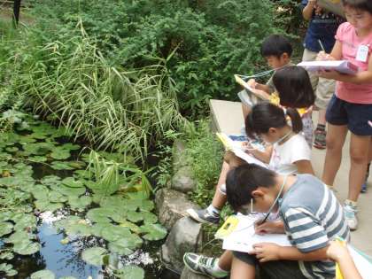 日曜参観のときにも観察をしていた動物のすみか観察の続きをしました。前回見つけられなかった生き物も見つけることができて,とてもうれしそうでした。池のところではトンボがじっと葉の上に止まっていて,まるでみんなに「かんさつしていいよ」と言ってくれているようでした。みんなも次々やってくる友だちに「トンボがいるから静かに」と声をかけあいながら観察していました。