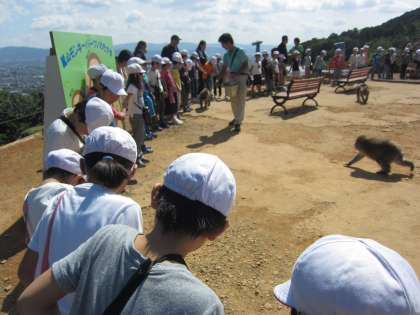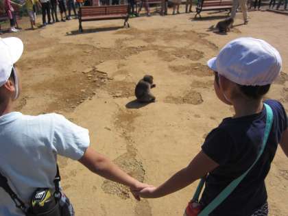 3年生全員で手を繋ぎ円になり,その円の中で職員さんが栗の実を投げます。すると,おサルさんたちは,子どもたちの足の間を通って円の中にやってきます。そして,モグモグおいしそうに栗を食べていました。
