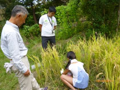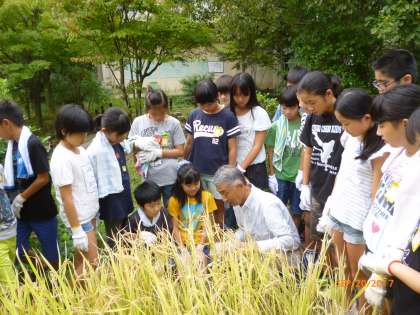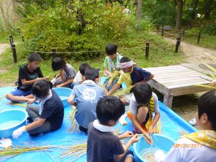 今日は秋らしいさわやかなお天気にめぐまれ、朝から稲刈りをしました。地域の青木さんから、田植同様、稲刈りの仕方も教えていただきました。刈り取った稲の穂先から、モミを手でとって収穫しました。