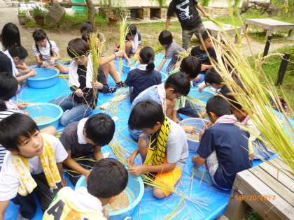 みんなシートの上でせっせと穂からモミをとる作業に熱中していました。おいしいご飯になるといいね。