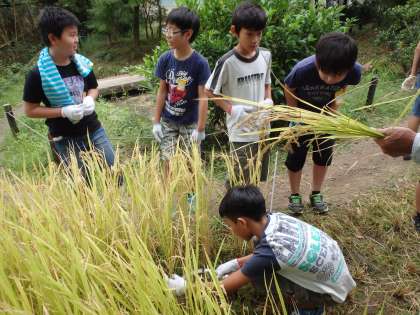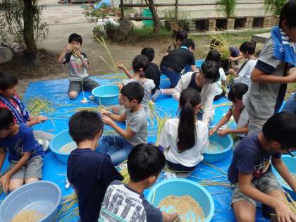 穂先に米が残っていないか確かめながら、脱穀に精を出していました。
