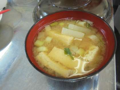 みそ汁は煮干しでだしをとってから、油あげと大根とねぎを入れて作ります。