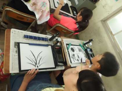 図画工作の学習で「墨で表す」という学習をしました。墨と筆を使って,墨の濃さを意識して思い思いに半紙に絵を描きました。子どもたちは,「墨のかすれ具合がいい感じ。」「適当に描いたら○○になってきた。」など,楽しんで描いていました。