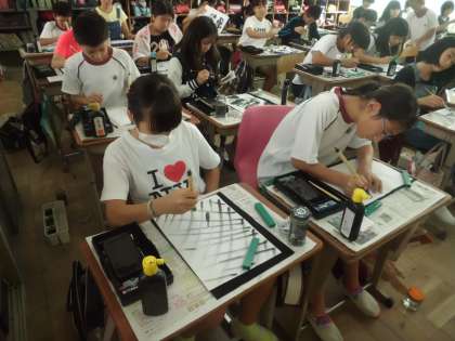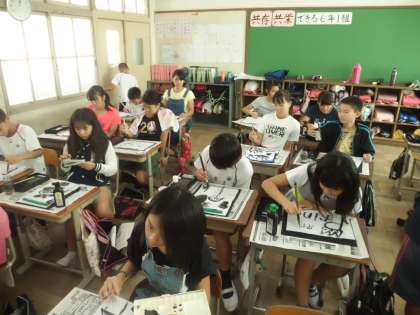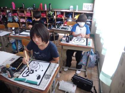 社会科の学習で学んだ雪舟の水墨画を目指して,墨で絵を表現しました。子どもたちは,「雪舟は,こんな感じであの素敵な絵を描いたのか。」と感動しながら,自分なりの絵を一生懸命描きました。